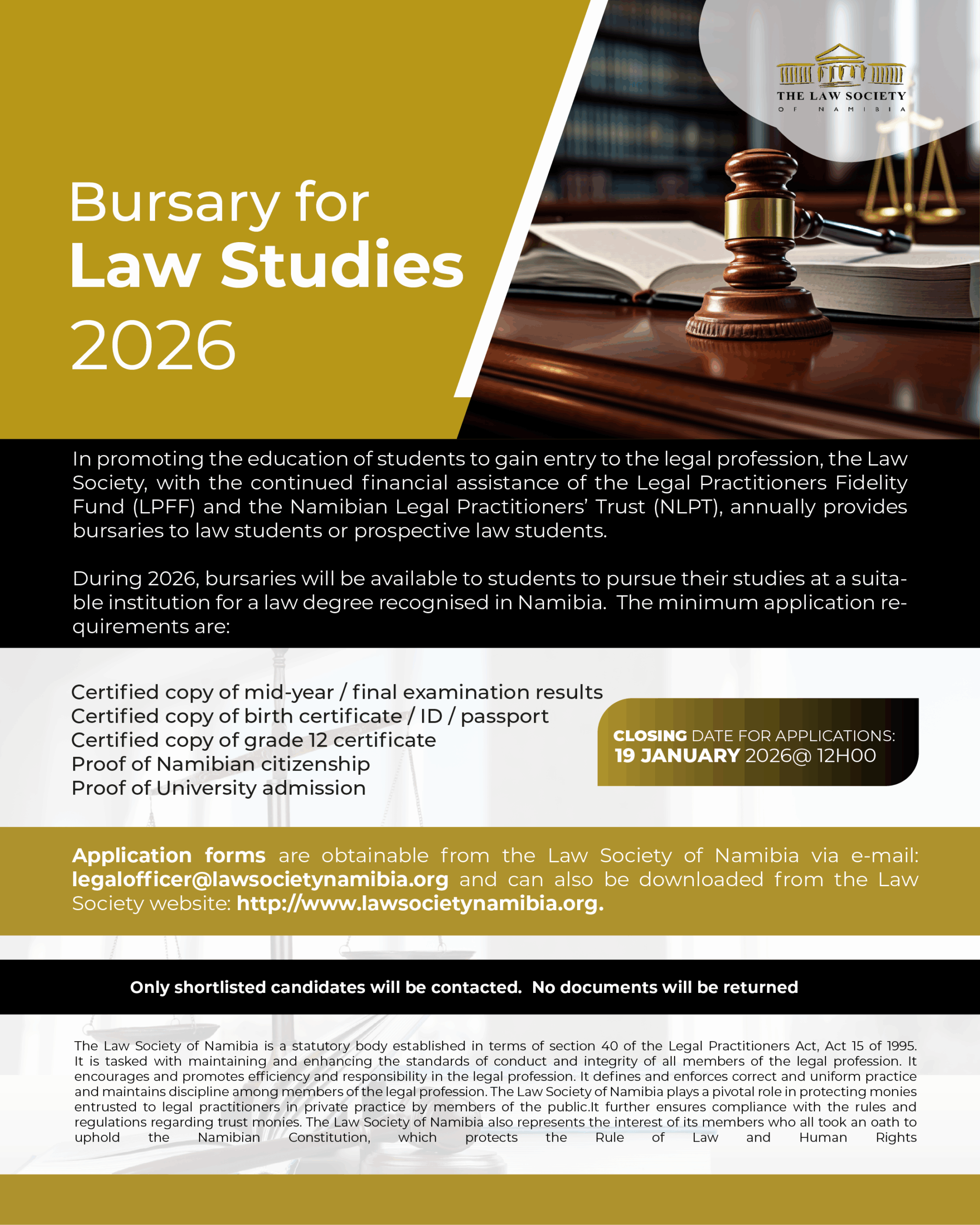 New bursaries will be available to students to pursue their studies at a suitable institution for a law degree recognised in Namibia. The minimum application requirements are: